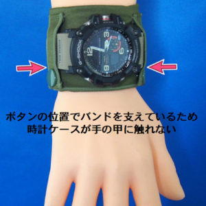 ◎青枠の所は、突起部分は腕に装着しても生地がめくれないよう2枚合わせ。時計のバンド吊り部分も、長く使用しても伸びないように2枚合わせ。