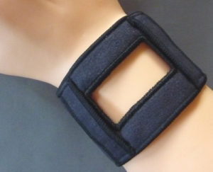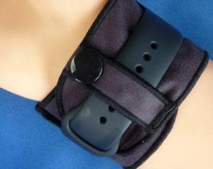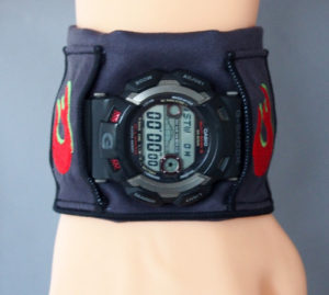 写真は、アームハンカチプロMF。ランニングやテニスなどの激しく腕を振るシーン用に開発した商品。3点のバンドでウォッチを留めるからズレが皆無。