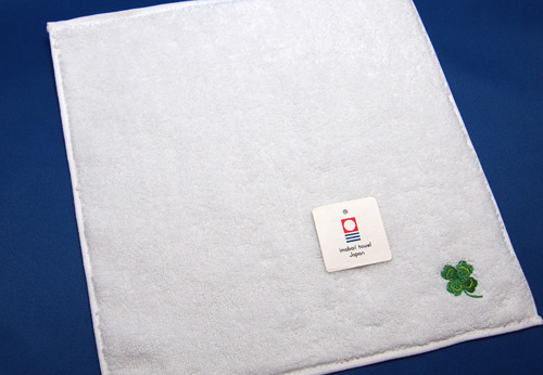 今治産タオルでも、特に品質の優れている物のみ許されるロゴネーム付きのタオルハンカチに四つ葉のクローバー刺繍をしました。本品はハンカチ専用生地のため織りあがりが細かく1枚で数年は使えるすぐれものです。