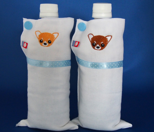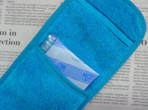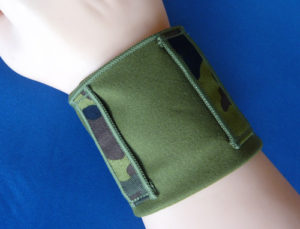 1.写真(下)のハンカチを3つ折りして両端の面ファスナーを合わせて手首に装着する。