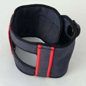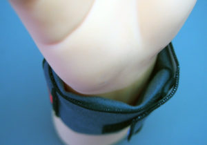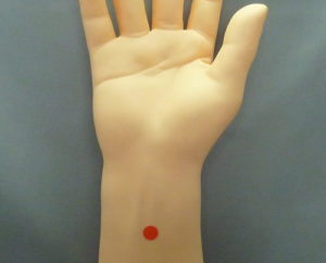 上記の赤いシールの所が「内関」のツボ。スナップボタンの吊りバンドがちょうどツボの所にきます。