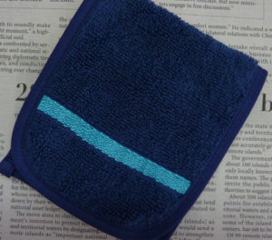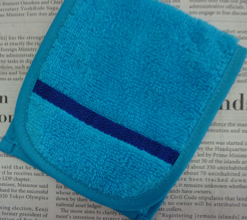 弊社製のマイクロファイバーアームはんかち。3折りした状態。