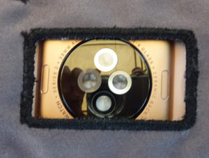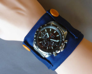 ●日本製の昇華転写したマイクロファイバー製の「アームハンカチ」だから時計を巻いても最大1穴バンドが大きくなるだけ。生地厚さ約0.7ミリ。3折りしても最大約2.1ミリの厚さ(面ファスナーが重なる部分)